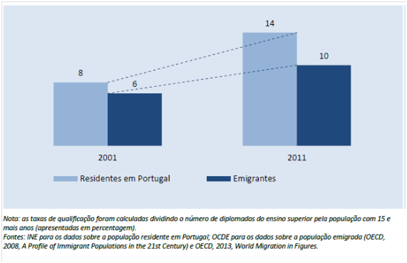 Percentagem de emigrantes portugueses com ensino superior nos países da OCDE cresceu mais 50% (de 7% para 11%) entre 2001 e 2011 mas a percentagem de portugueses residentes com formação superior é mais elevada.